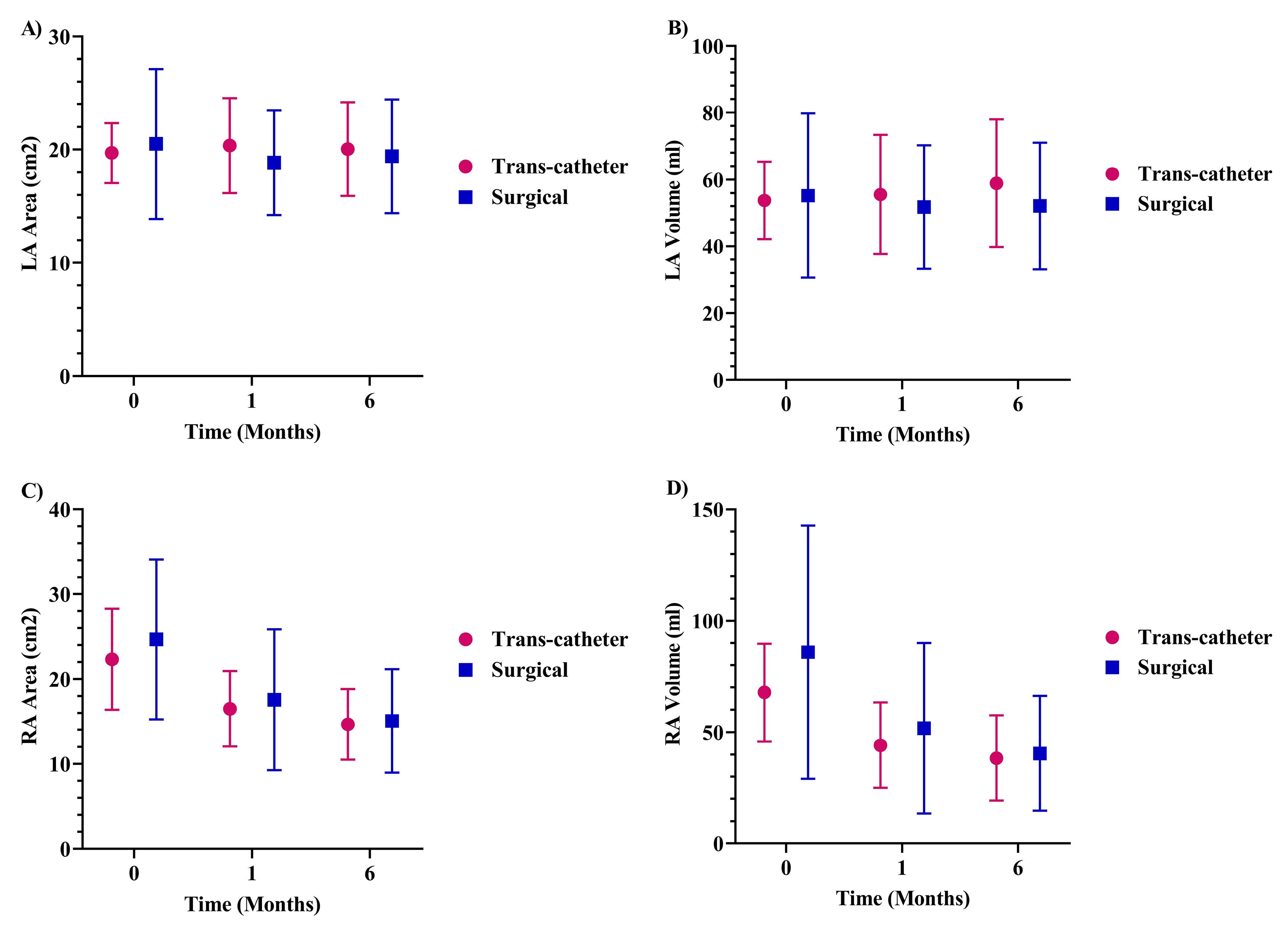 The LA area and volume did not change significantly in the studied patients during one and six months of follow-up (Table 2). The RA area at baseline was 23.67 ± 8.06 cm2, which decreased considerably to 17.10 ± 6.83 cm2 in the 1-month follow-up (P < 0.001), compared to 14.89 ± 5.24 cm2 in the 6-month follow-up, which had a significant reduction compared to the baseline (P < 0.001, Table 2). Additionally, the right-to-left atrial area ratio decreased by 24.31% during the first month and 33.17% during the six months of follow-up, which were statistically significant (P < 0.001, Table 2). Furthermore, the RA volume was remarkably mitigated in the first and sixth months compared to the first visit (P < 0.001, Table 2). Changes in the RA and LA volume and area over time were insignificant between the trans-catheter and surgical procedures (Figure 2).